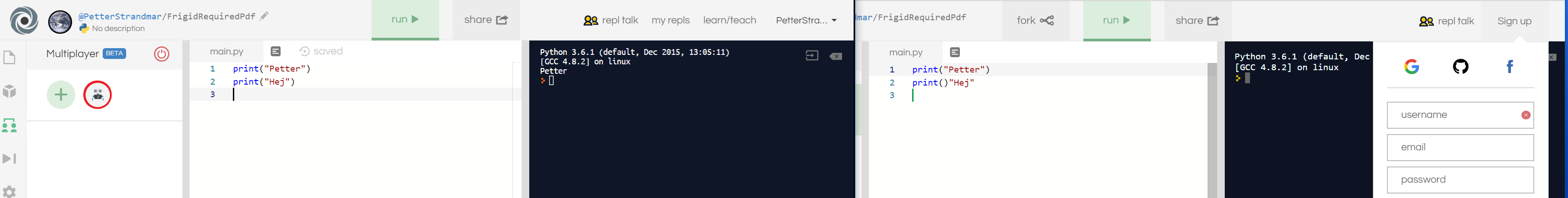 I was giving a talk about Python at a club in school and I wouldn't be able to have everyone install an IDE or Python on their computers at the moment. So in the planning phase a fellow club member suggested Repl.it, so that they could run and test the commands we showed. This was a few months ago and it didn't have the multiplayer feature then. I found myself using it recently because I wanted to help a friend with a program idea that was unrelated to the class we were in, I remembered Repl.it and it turned out to have 'multiplayer' in beta, making it easier to talk in class without repeatedly chatting though inline comments.